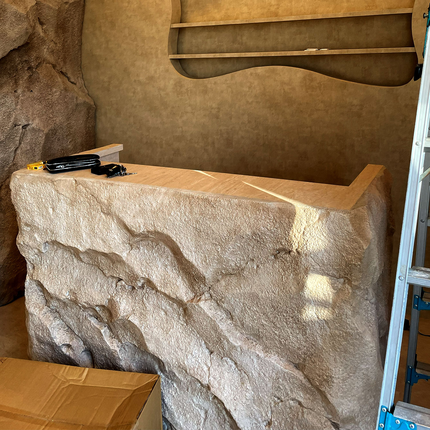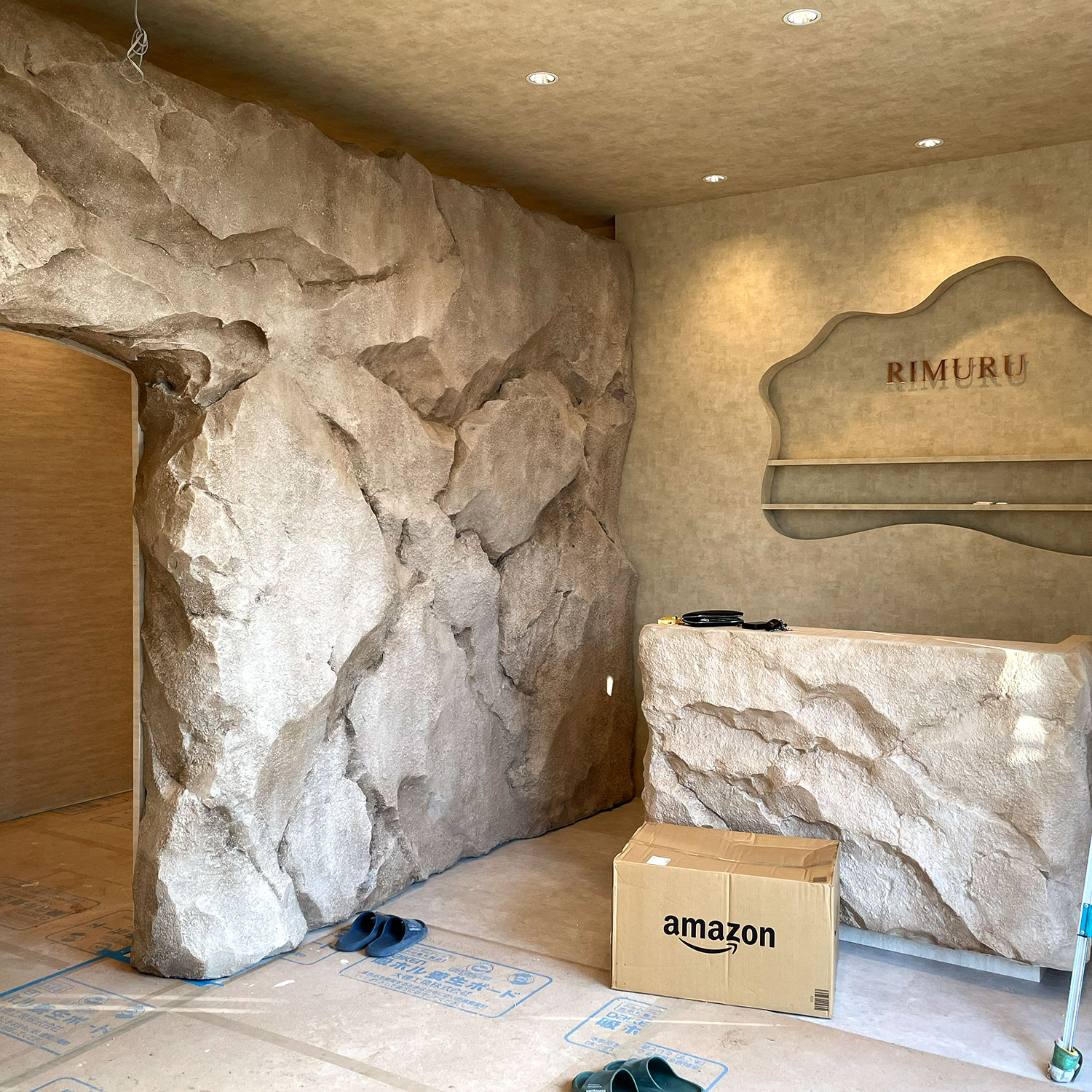 物語性のある世界観を表現するため、岩肌や石壁をモチーフにしたモルタル造形を施工しました。